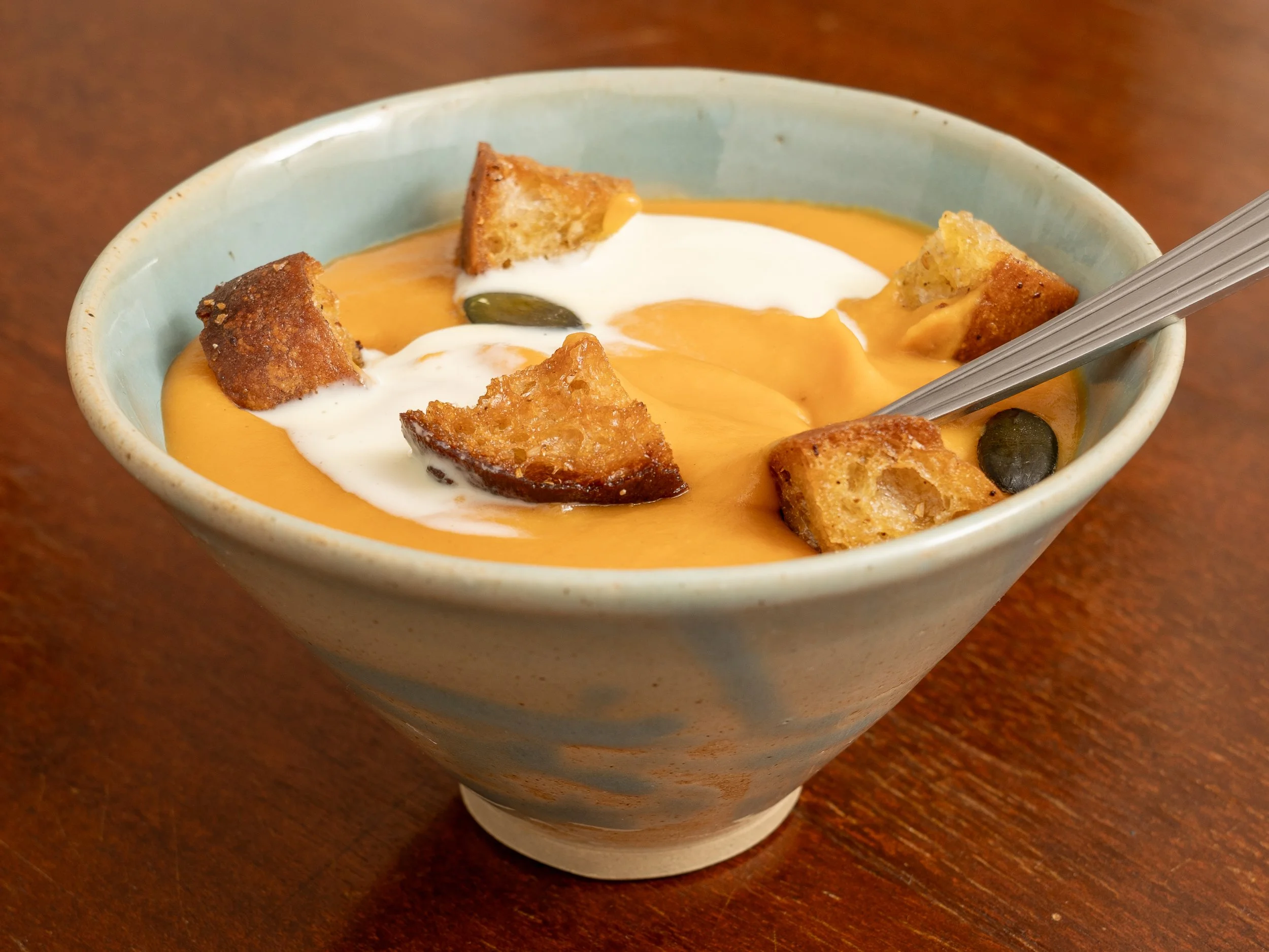 Servez chaud, décoré de graines de courge, avec des croutons de pain grillé comme moi.